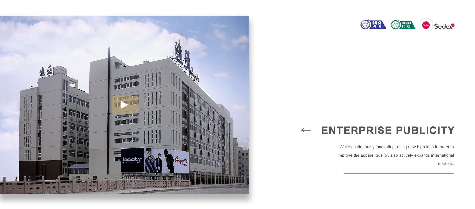 浙江迪亞服飾有限公司于1998年在世界時尚品牌之都——法國巴黎二區(qū)應運而生。同年,在浙江省甌海經(jīng)濟開發(fā)區(qū)東方南路28號設立服裝制造工廠。公司集服裝設計、生產(chǎn)、營銷、品牌于一體,在不斷創(chuàng)新、采用高新技術(shù)提高服飾質(zhì)量的同時,積極拓展國際市場,海外營銷部長期與LV集團旗下的MAJE、SOEUR、BALIBARIS等國際著名品牌保持非常緊密的合作關(guān)系。品牌建設是公司堅持不懈的追求,我們每年都會積極參加國內(nèi)外舉辦的各大服裝展銷會。憑借著良好的質(zhì)量與信譽,市場占有率在逐漸擴大,產(chǎn)品遠銷歐洲、美洲、亞洲等國。公司以生產(chǎn)棉衣、羽絨服、派克、大衣、夾克、運動休閑服飾等為主,旗下主打品牌有 ORANGE D’OR 、CLAIRVAL、BOOTY JEANS 、S&V和SASAEC,各品牌服飾均以典雅的色彩、優(yōu)美的線條、卓越的魅力吸引著都市麗人,將時尚、經(jīng)典的潮流信息予以淋漓盡致的演繹。